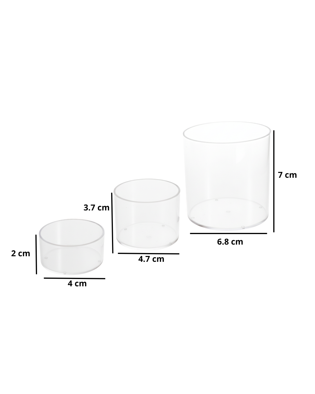 Fabricados en acrílico de alta resistencia, estos vasos son ideales para elaborar velas en recipientes. Su diseño cilíndrico y paredes lisas permiten un vertido uniforme de la cera, resaltando el color y la textura final de la vela. El material es ligero pero resistente al calor, ofreciendo mayor seguridad y durabilidad frente al vidrio.