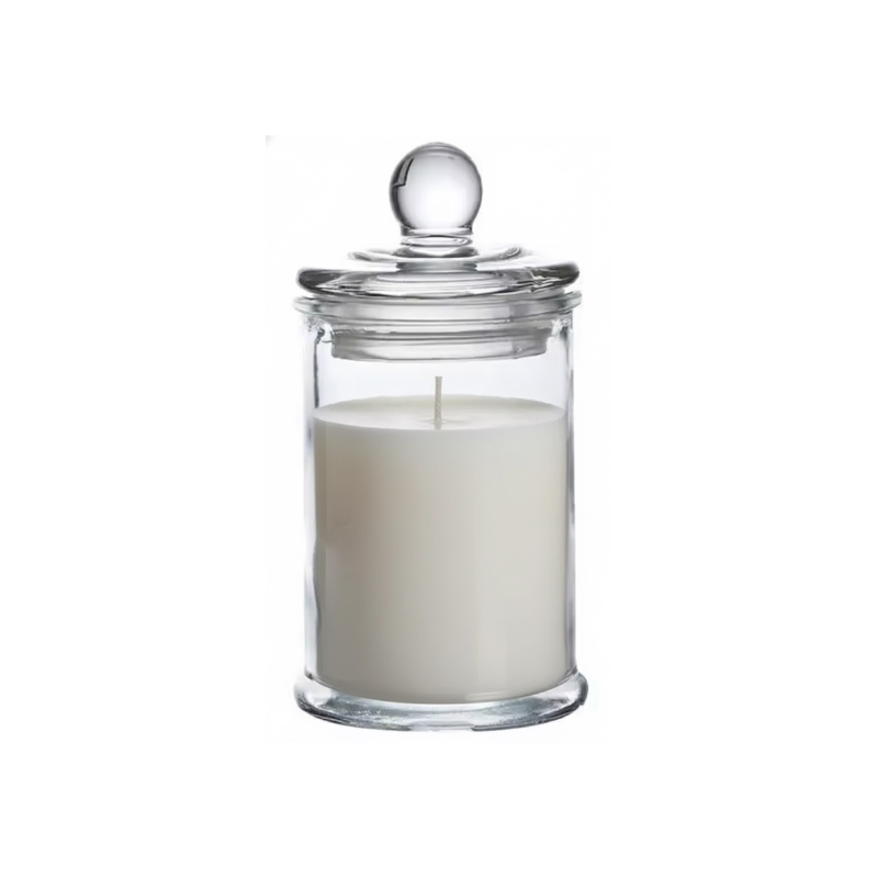 Frasco de vidrio con tapa esférica, ideal para la elaboración de velas decorativas, almacenamiento o ambientación de espacios. Fabricado en vidrio grueso, transparente y resistente al calor, lo que permite apreciar el color de la cera y las decoraciones internas. Su tapa con botón superior asegura un cierre apropiado, ayudando a conservar aromas en velas aromáticas o fragancias en espacios.