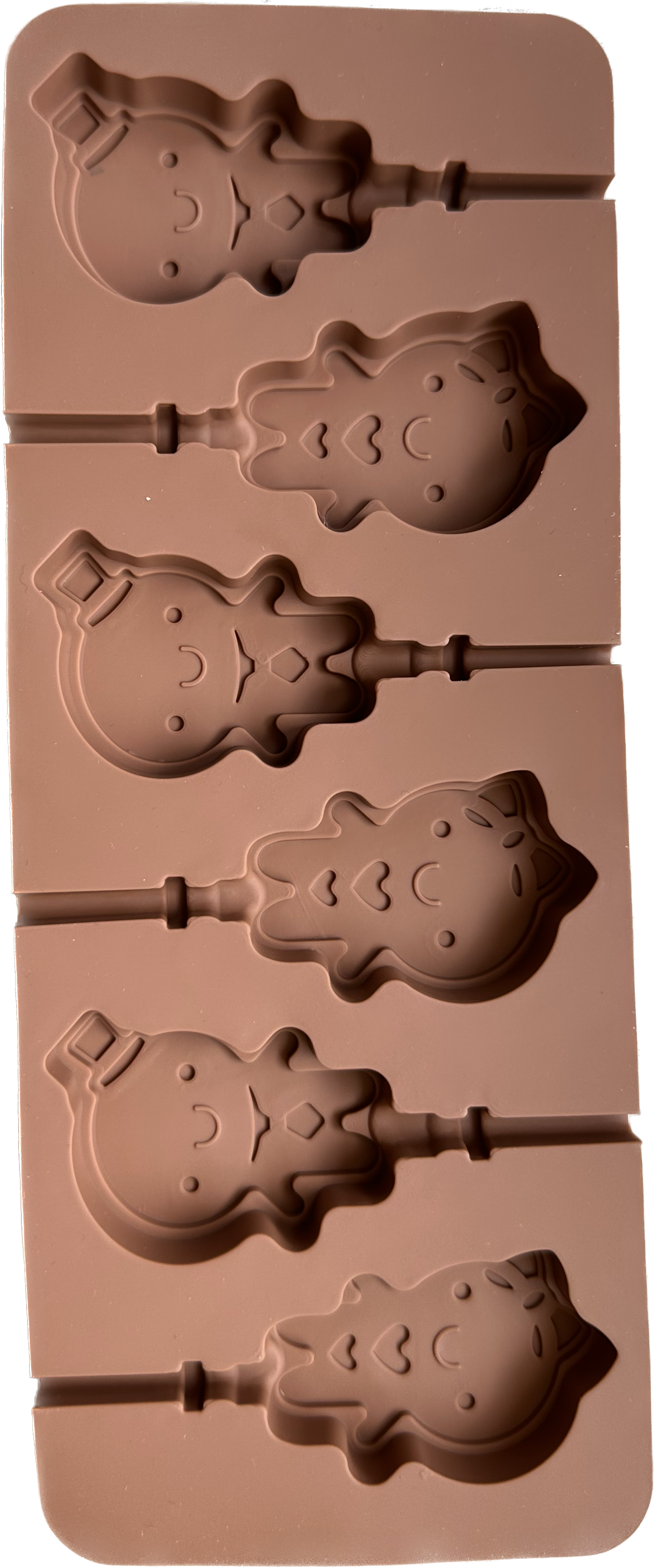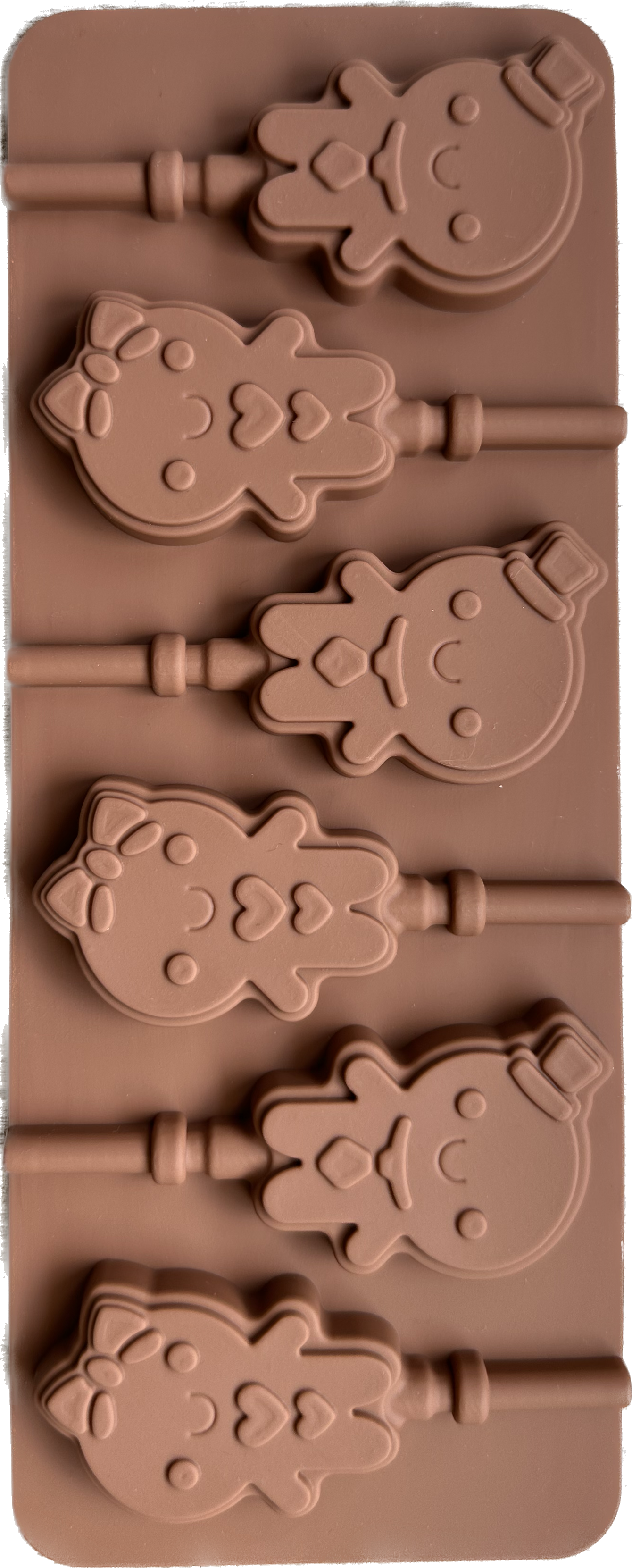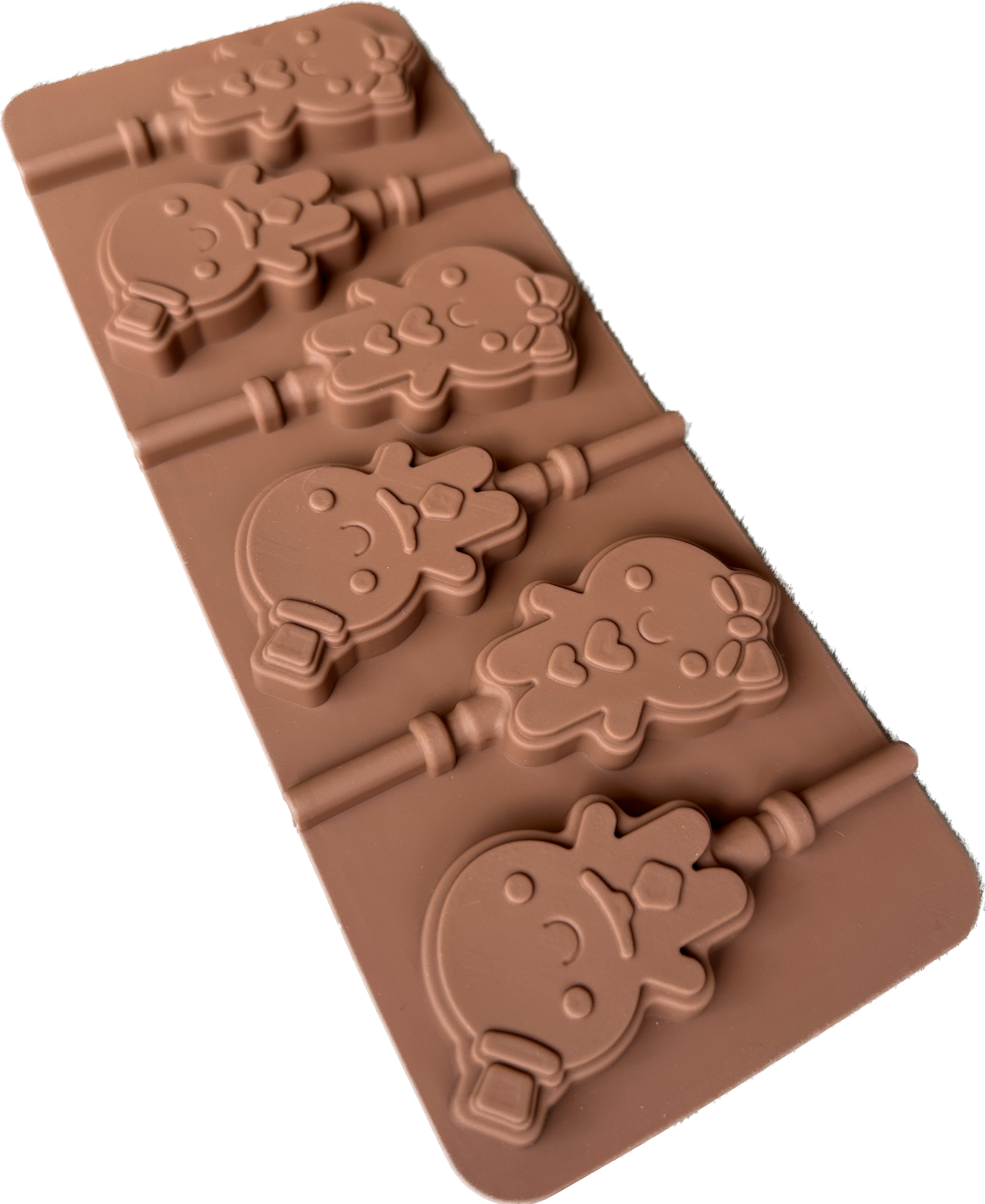 - Dimensiones: El molde cuenta con 3 cavidades con forma de niña con moño y 3 cavidades de niño con sombrero. Cada cavidad mide aproximadamente 4.7 cm de alto por 3 cm de ancho.